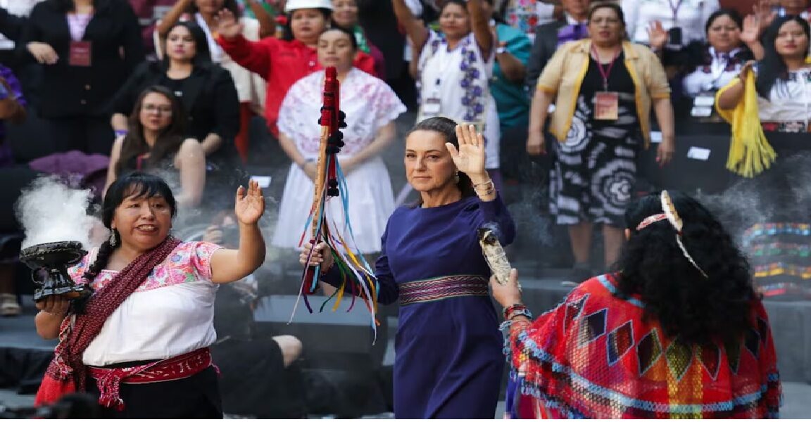 «Se lleva a cabo el ritual de limpia, purificación, así como la invocación de los cuatro rumbos y el centro del universo. De igual manera se hace la entrega del bastón de mando por parte de autoridades indígenas a la doctora Claudia Sheinbaum Pardo, presidenta de los Estados Unidos Mexicanos», se informó al inicio del acto.