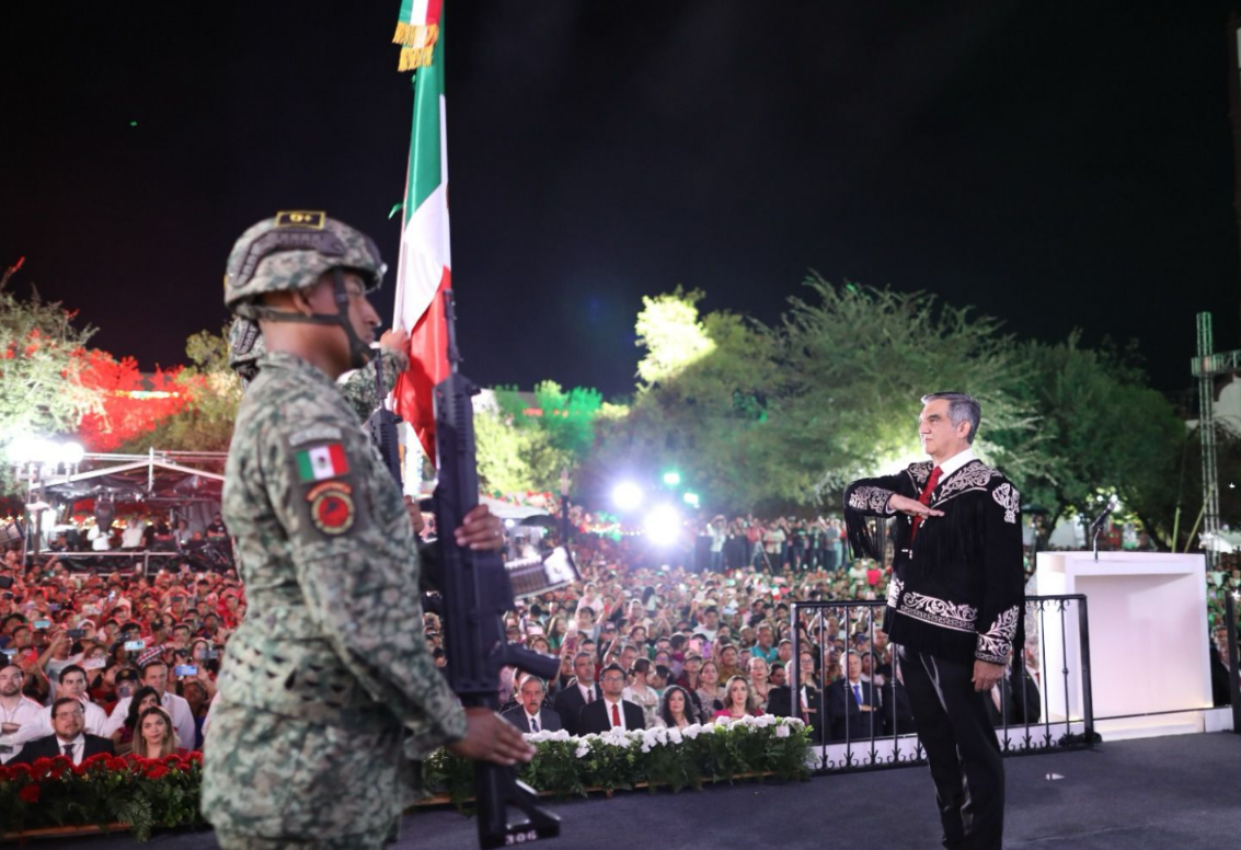 Desde la escalinata principal de Palacio de Gobierno, el gobernador de Tamaulipas recibió la bandera nacional de manos de la escolta del 77 Batallón de Infantería y exclamó.