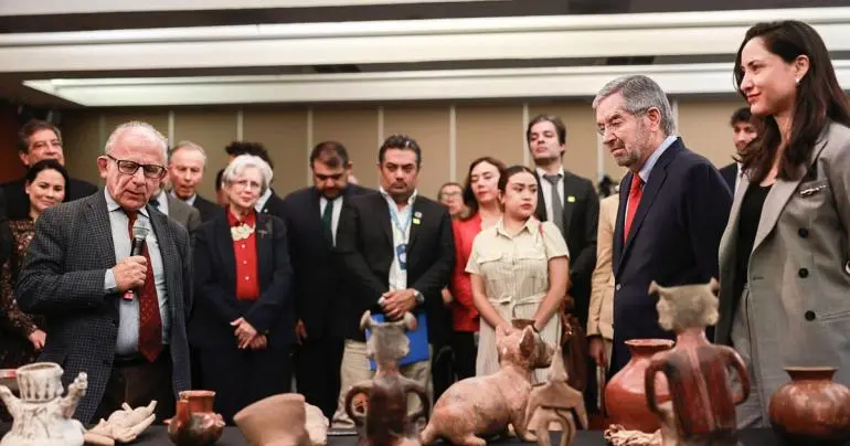El canciller, Juan Ramón de la Fuente, encabezó la recepción de las piezas del patrimonio cultural mexicano en una ceremonia en el marco del Día Internacional contra el Tráfico Ilícito de Bienes Culturales, establecido por la Unesco.