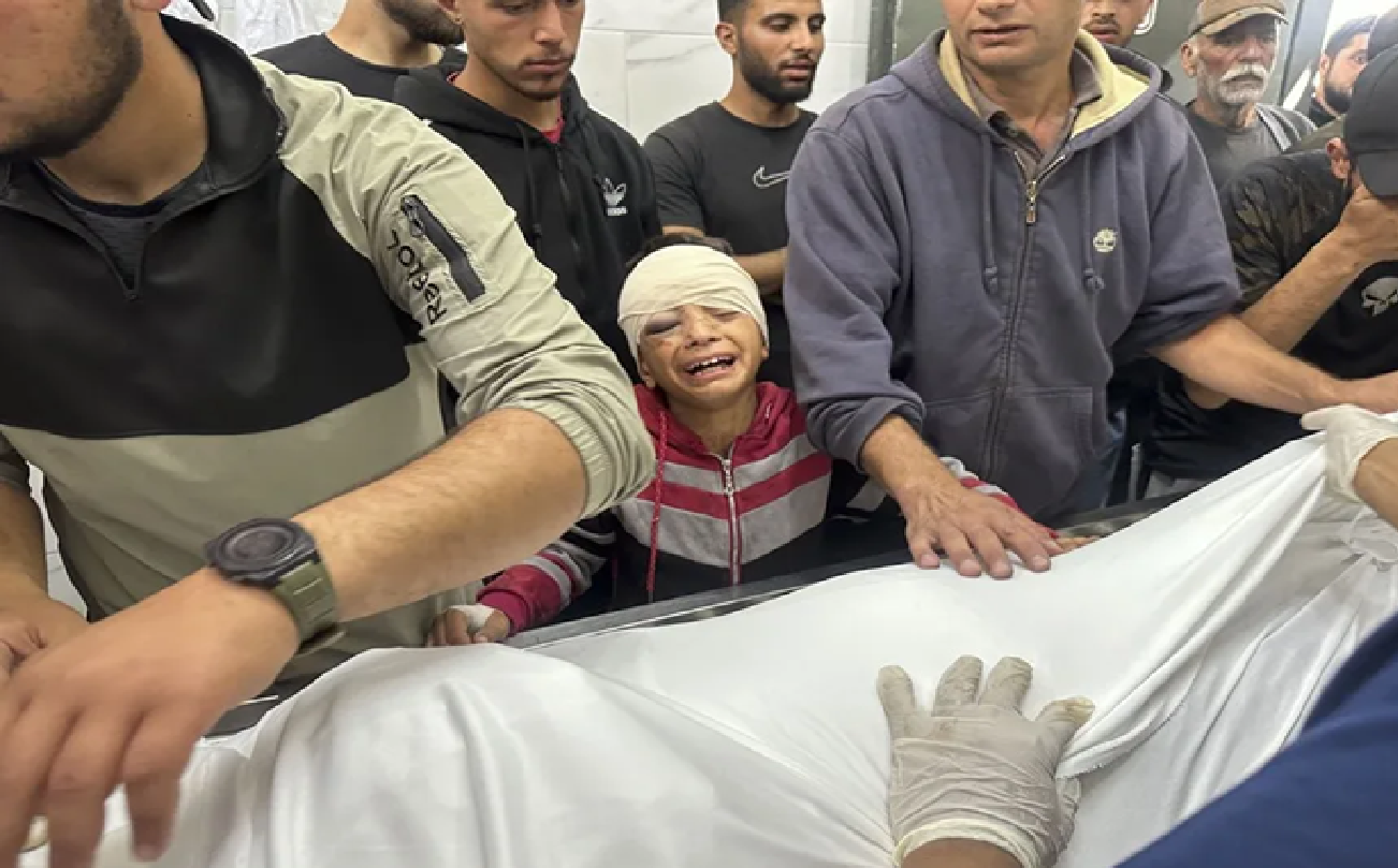 Familiares de una víctima del ataque israelí a una escuela en Gaza lloran ante su cadáver en el Hospital Al Shifa. EFE/ Ahmad Awad