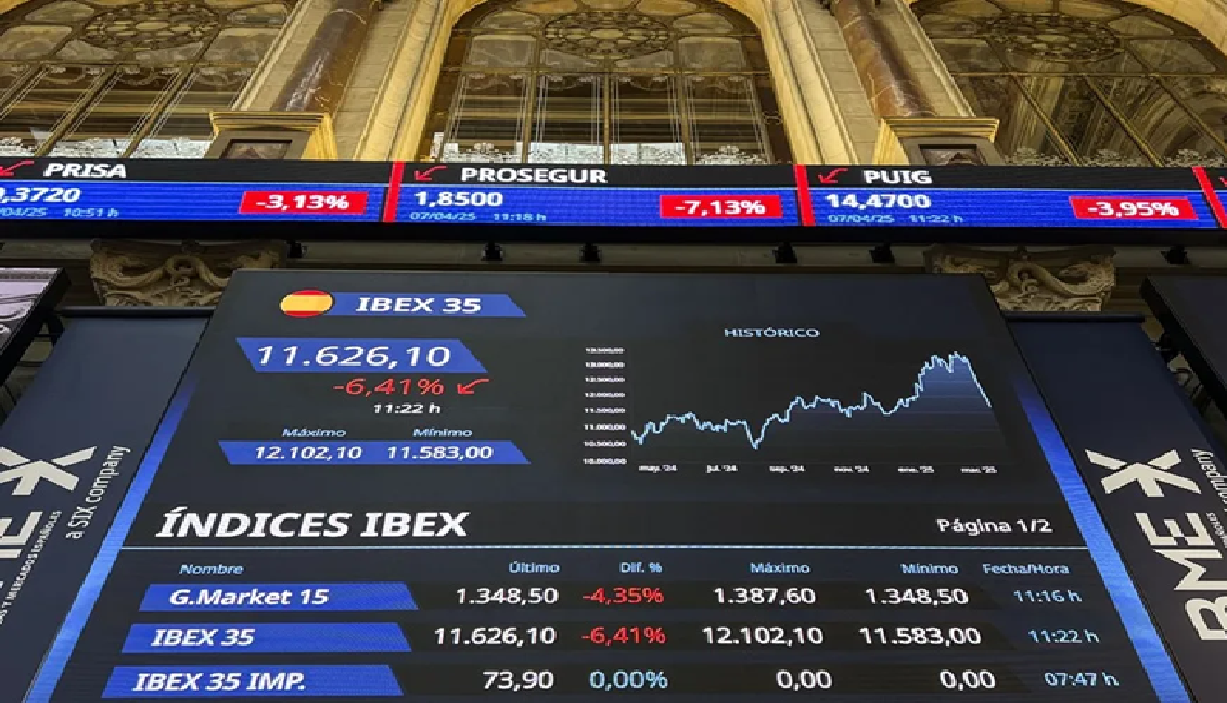 Las principales bolsas europeas registran esta mañana pérdidas en torno al 6 % lastradas por el desplome de los mercados asiáticos tras la caída el viernes de Wall Street y ante el creciente temor de los inversores a que la política arancelaria de EE.UU. provoque una recesión.